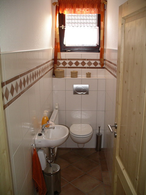 - Bad mit moderner Runddusche - separate Toilette - Waschmöglichkeit mit Spiegel |